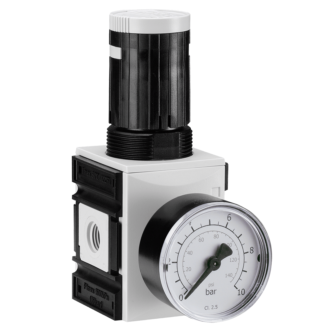 De drukregelaars zijn verkrijgbaar zonder filter-waterafscheider: model KN-KREG, of juist met filter-waterafscheider: model KN-KFRG. Alle drukregelaars zijn verkrijgbaar in 6 uitgaande druk bereiken. (zgn. secundaire drukken) en zijn standaard voorzien van een manometer met bijpassende schaalverdeling. Kies het kleinste drukbereik dat bij uw toepassing past zodat u de druk nauwkeurig kunt instellen. In de producttabellen zijn de artikelen voor in te stellen uitgangsdrukken van 0,5 tot 8 bar vermeld.